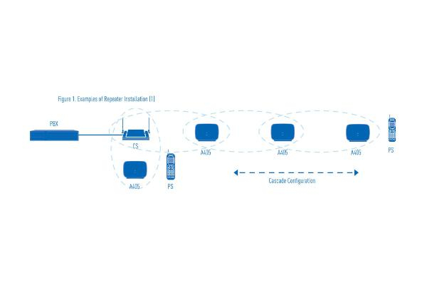 The A406 DECT repeater extends the range in all directions, allowing for a wider area to be covered. A single cell station can register up to 6 A406 repeaters while each repeater can
