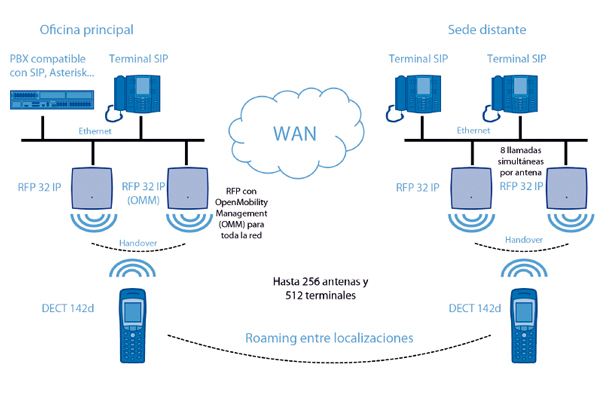 Indoor and outdoor RFPs are used to set up a DECT radio network over the entire company premises. The indoor variant (RFP L32 IP) has an integrated omni-directional antenna, while the outdoor RFP (RFP L34 IP) may use either a directional antenna or a dipole antenna.
